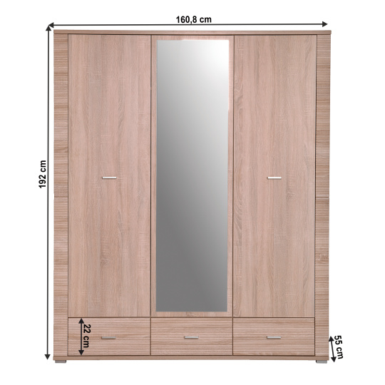 Skříň věšáková typ 02, se třemi policemi a třemi zásuvkami, vhodná na zařízení obývacích pokojů, ložnic i pracoven, materiál: DTD laminovaná. Hrany jednotlivých komponentů jsou ukončeny vroubkovanou lištou. Barevné provedení: dub sonoma. Rozměry (ŠxVxH): 160,8x192x55 cm. Tloušťka materiálu korpus: 16 mm Tloušťka materiálu vrchní desky: 22 mm Tloušťka materiálu spodní desky: 22 mm Dodávána v demontu, pouze na objednávku s dodací lhůtou 5-7 týdnů.