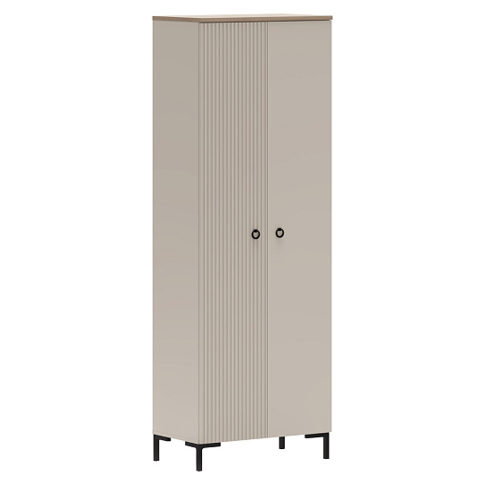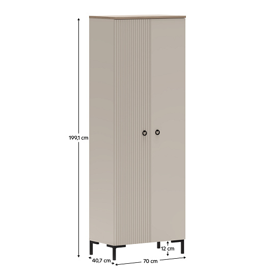 Materiál: laminovaná DTD/fóliovaná MDF Barva: šedohnědá Taupe/dub silverjack Rozměry (ŠxHxV): 70x40,7x199,1 cm Tloušťka materiálu DTD: 1,6-1,8 cm Tloušťka materiálu MDF: 1,9 cm Dvoudveřová Policová Výsuvná věšáková tyč Nosnost police: 5 kg Univerzální dvířka S úchyty Materiál úchytek: kov Barva úchytek: matná černá Na nožičkách Výška nožiček: 12 cm Materiál nožiček: plast Barva nožiček: matná černá Dekorativní frézovaná dvířka Moderní design Doporučujeme připevnit ke stěně Dodáváno v demontu