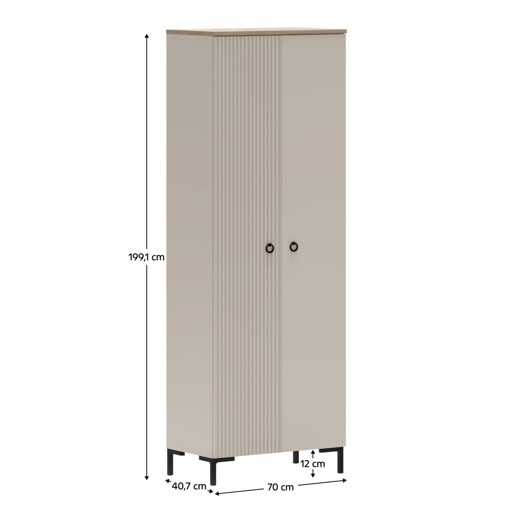 Materiál: laminovaná DTD/fóliovaná MDF Barva: šedohnědá Taupe/dub silverjack Rozměry (ŠxHxV): 70x40,7x199,1 cm Tloušťka materiálu DTD: 1,6-1,8 cm Tloušťka materiálu MDF: 1,9 cm Dvoudveřová Policová Výsuvná věšáková tyč Nosnost police: 5 kg Univerzální dvířka S úchyty Materiál úchytek: kov Barva úchytek: matná černá Na nožičkách Výška nožiček: 12 cm Materiál nožiček: plast Barva nožiček: matná černá Dekorativní frézovaná dvířka Moderní design Doporučujeme připevnit ke stěně Dodáváno v demontu