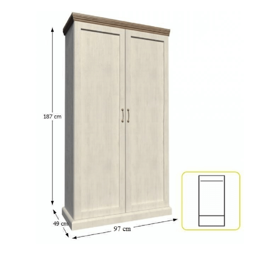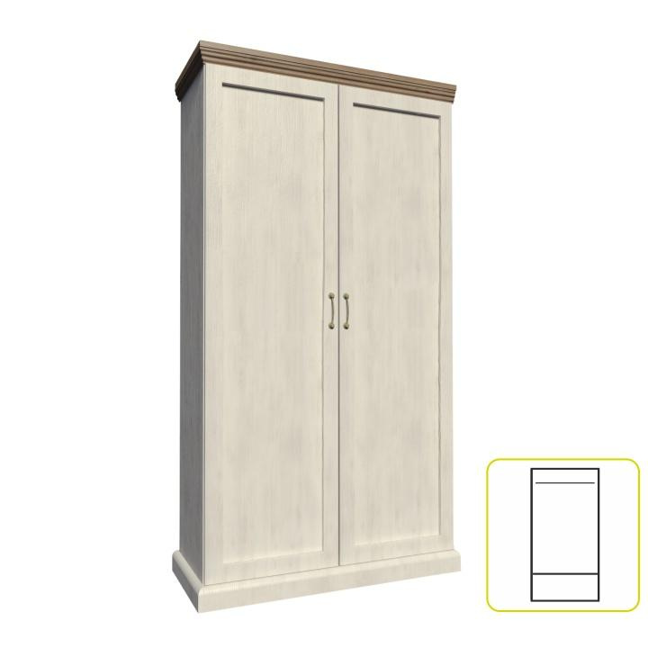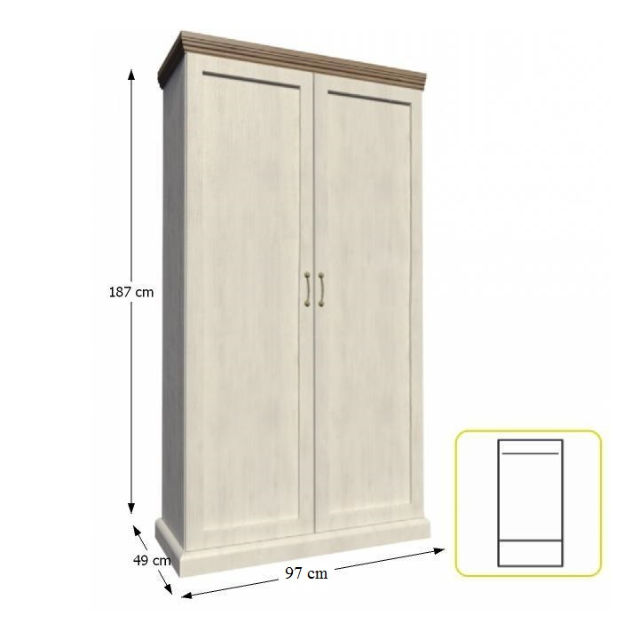 Věšáková skříň S2D s jednou policí z elegantního sektorového systému Royal v provensálském stylu. Vhodná na zařízení obývacích pokojů či ložnic. Materiál: korpus DTD laminovaná + ozdobné lišty, kovové úchytky Barevné provedení: sosna skandinávská / dub divoký Rozměry ŠxHxV: 97x49x187 cm Tloušťka materiálu korpus: 15 mm Tloušťka materiálu vrchní desky: 22 mm Dodávané v demontu.