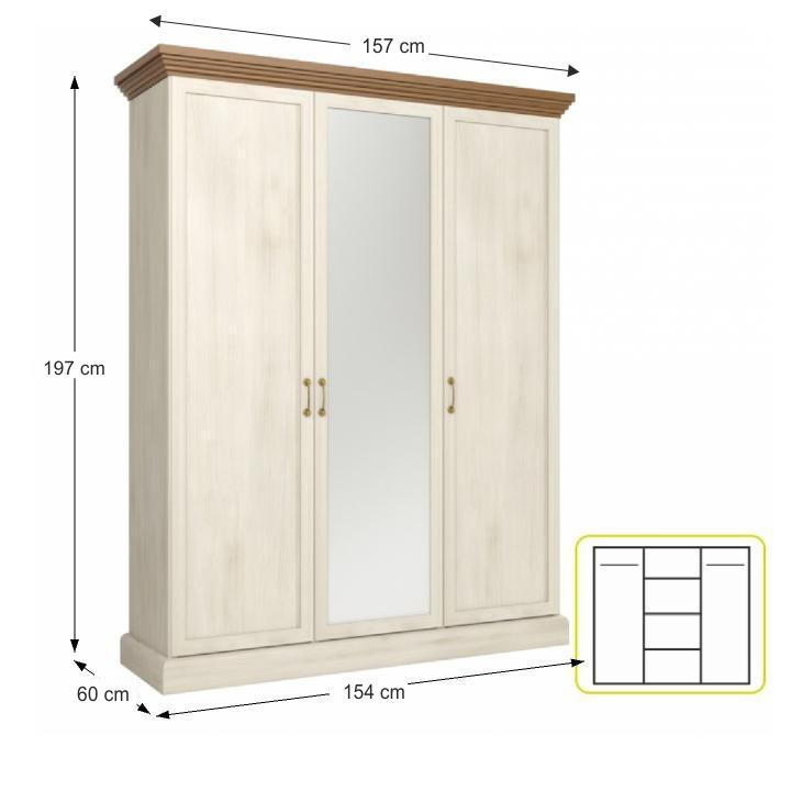 Věšáková a Poličkové skříň S3D se zrcadlem z elegantního sektorového systému Royal v provensálském stylu. Vhodná na zařízení obývacích pokojů či ložnic. Materiál: korpus DTD laminovaná + ozdobné lišty, kovové úchytky Barevné provedení: sosna skandinávská / dub divoký Rozměry ŠxHxV: 154x60x197 cm Tloušťka materiálu korpus: 15 mm Tloušťka materiálu vrchní desky: 22 mm Dodávané v demontu.