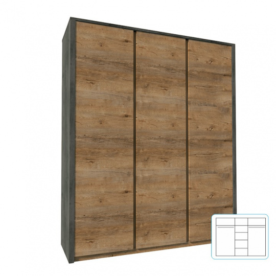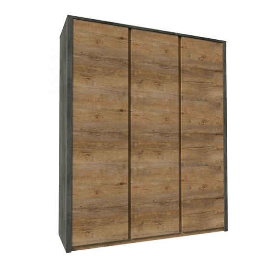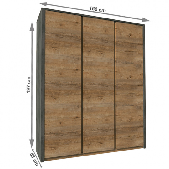Skříň třídveřová věšáková s policemi MONTANA S3D Materiál: DTD laminovaná/ABS hrany Barva: dub lefkas tmavý/smooth šedý Rozměry ŠxHxV: 166x53x197 cm. Tloušťka materiálu: 15 mm Dodávané v demontu.