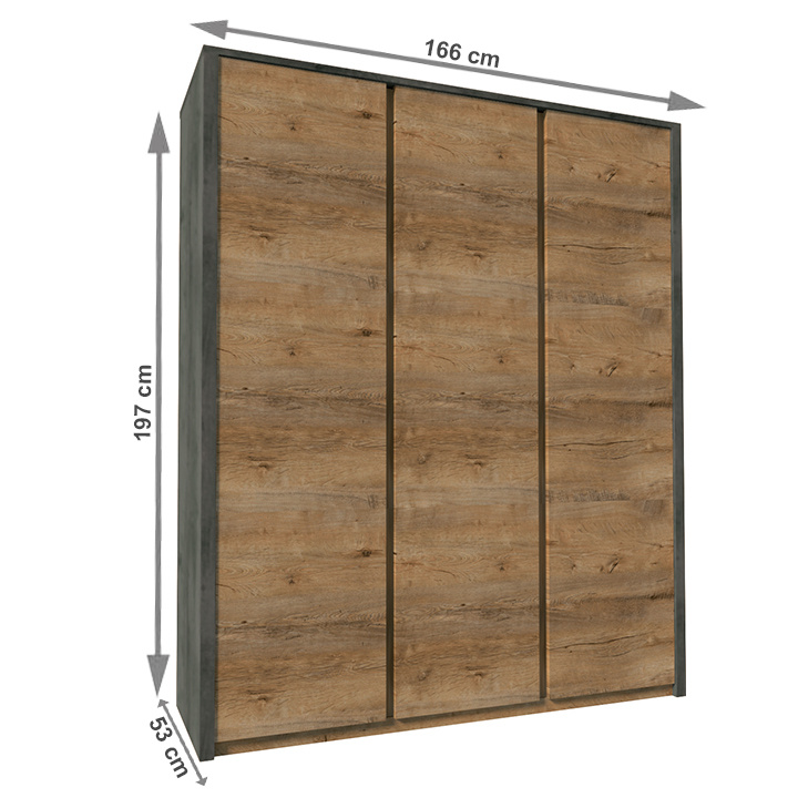 Skříň třídveřová věšáková s policemi MONTANA S3D Materiál: DTD laminovaná/ABS hrany Barva: dub lefkas tmavý/smooth šedý Rozměry ŠxHxV: 166x53x197 cm. Tloušťka materiálu: 15 mm Dodávané v demontu.