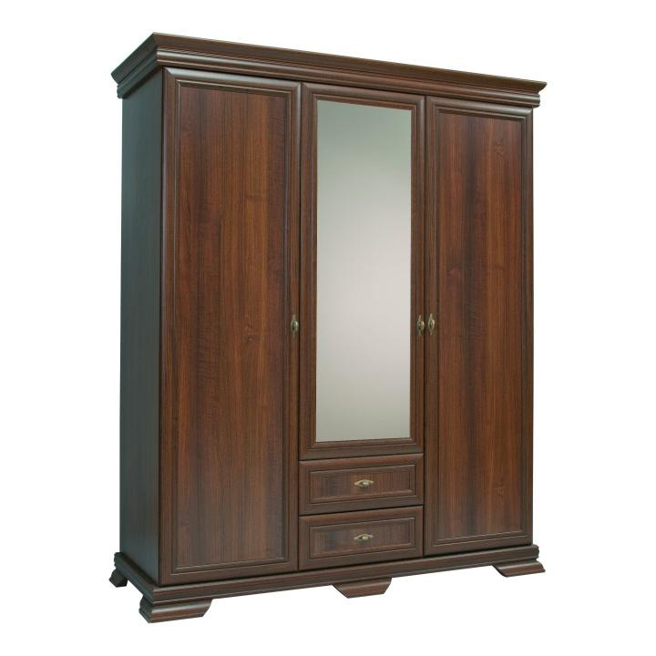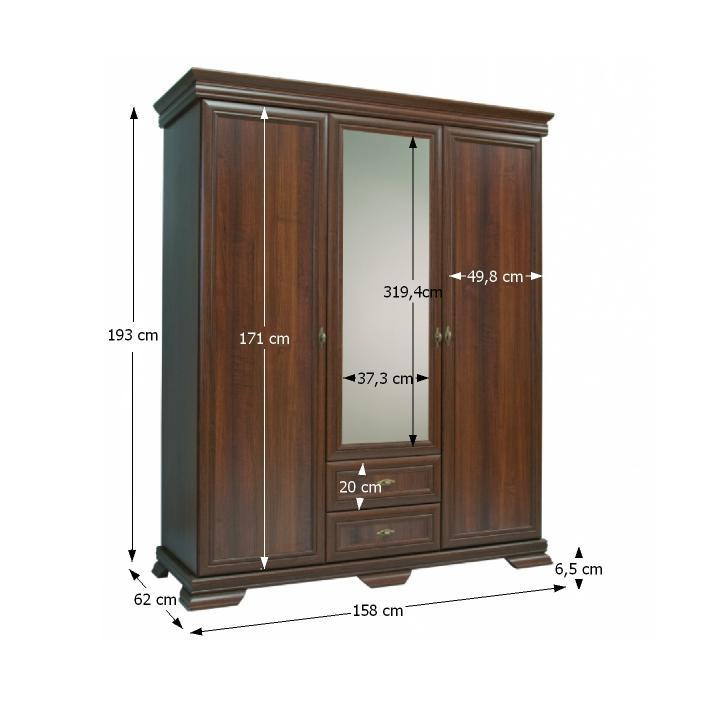 Třídveřová skříň KS2 KORA. Barevné provedení samoa king. Materiál laminovaná DTD, MDF, kov, zrcadlo Rozměry (ŠxHxV): 158x62x193 cm Tloušťka materiálu korpus: 15 mm Tloušťka materiálu vrchní desky: 22 mm Tloušťka materiálu dolní desky: 22 mm Výška spodního prostoru od podlahy: 10,5 cm