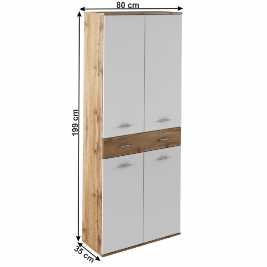 Materiál: DTD laminovaná Barva: dub Wotan / bílá Rozměry (ŠxHxV): 80x35x199 cm čtyřdveřová policová šuplík S úchytkami Kvalitní slovenský výrobek Dodávané v demontu