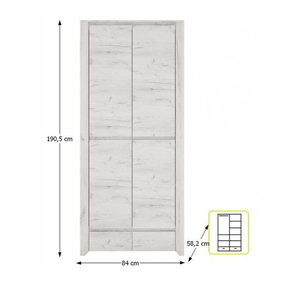 Dvoudveřová skříň TYP 20 ze sektorové sestavy ANGEL Materiál: laminovaná DTD Barva: bílá craft Rozměry (ŠxHxV): 96x96x190,5 cm Tloušťka materiálu: 16 mm Výška spodního prostoru od podlahy: 2,5 cm Dodávané v demontu