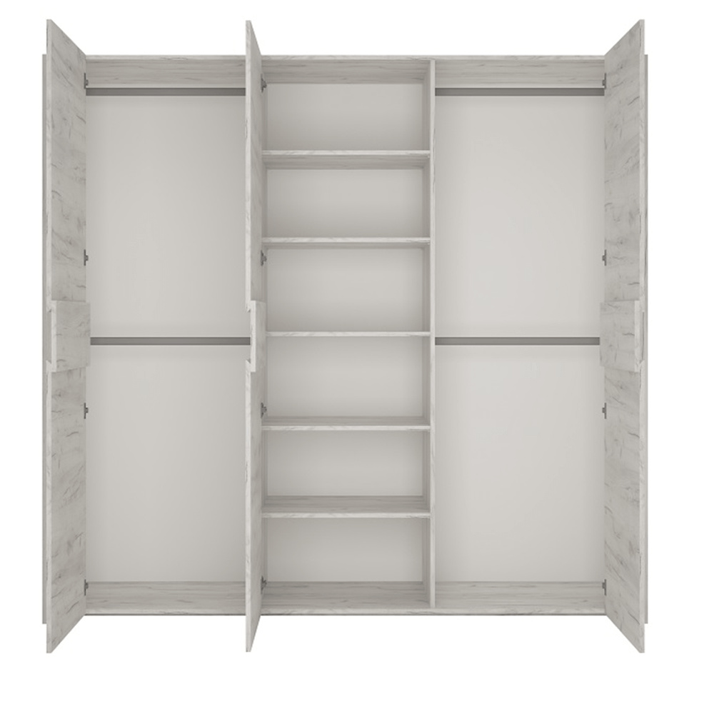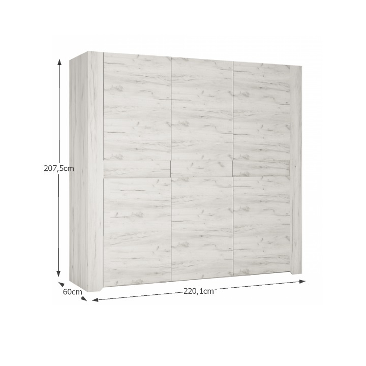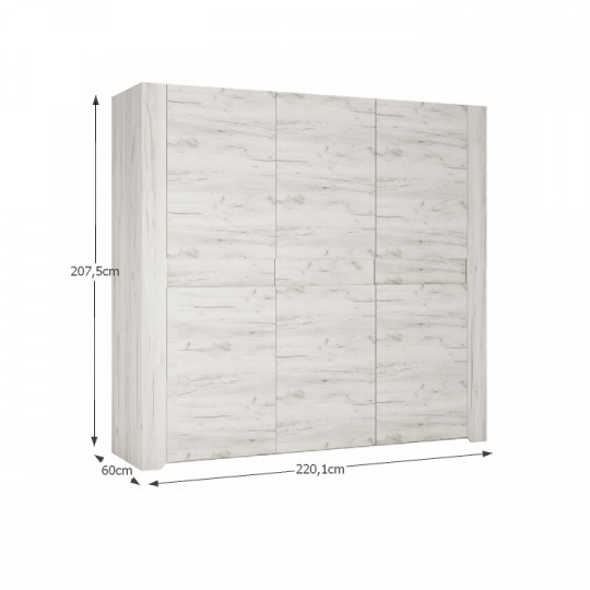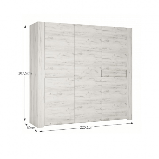 Skříň Typ 22 ze sektorové sestavy ANGEL. Rozměry (ŠxHxV): 220,1x60x207,5 cm Tloušťka materiálu: 16 mm Výška spodního prostoru od podlahy: 2,5 cm Barva: bílá craft Střední část policová, boční věšákové Dodávané v demontu