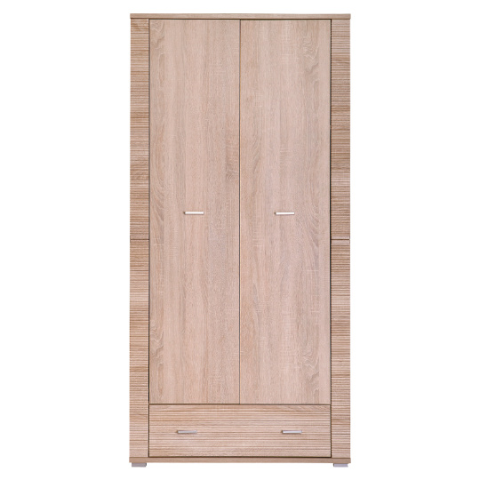 Skříň věšáková typ 02, se třemi policemi a třemi zásuvkami, vhodná na zařízení obývacích pokojů, ložnic i pracoven, materiál: DTD laminovaná. Hrany jednotlivých komponentů jsou ukončeny vroubkovanou lištou. Barevné provedení: dub sonoma. Rozměry (ŠxVxH): 160,8x192x55 cm. Tloušťka materiálu korpus: 16 mm Tloušťka materiálu vrchní desky: 22