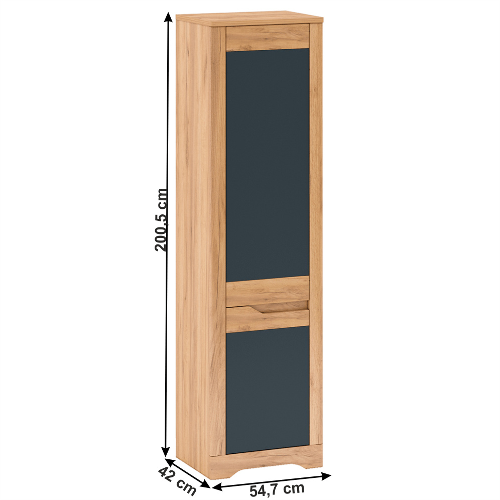 Materiál: DTD laminovaná / MDF fóliovaná Barva: dub craft zlatý /grafit šedá Rozměry (ŠxHxV): 54,7x42x200,5 cm Tloušťka materiálu korpus: 16 mm Tloušťka materiálu vrchní deska: 22 mm levé provedení police Dodávané v demontu