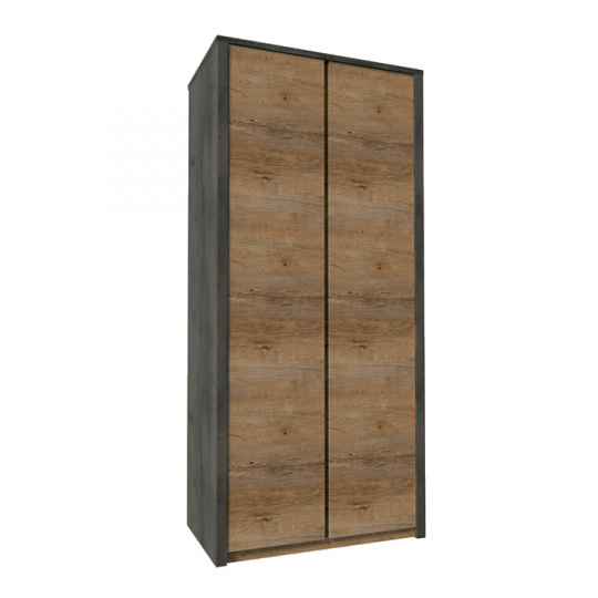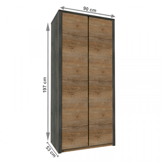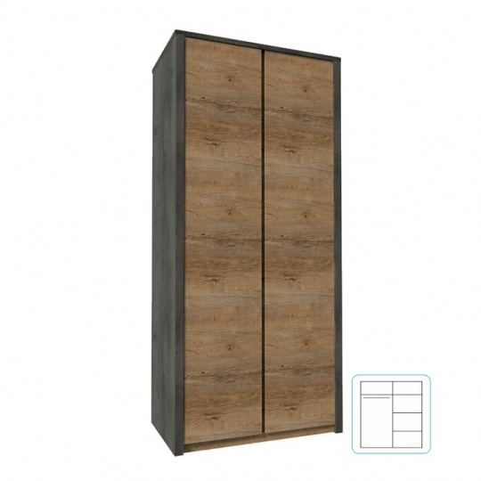 Skříň MONTANA S2D Materiál: DTD laminovaná / ABS hrany Barva: dub lefkas tmavý / smooth šedý Rozměry (ŠxHxV): 90x53x197 cm Tloušťka materiálu: 15 mm Dodávané v demontu.