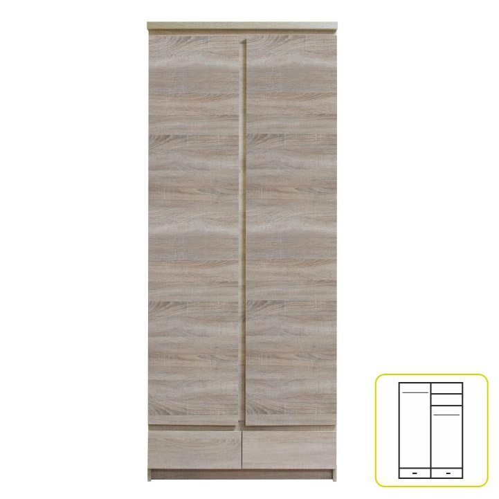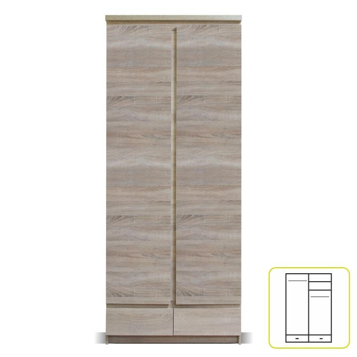 Skříň věšáková dvoudveřová, dvouzásuvková. TYP 01, materiál: DTD laminovaná. ABS hrany. Barevné provedení: dub sonoma. Rozměry ŠxHxV: 83x56x200 cm. Tloušťka materiálu korpus: 16 mm Tloušťka materiálu vrchní desky: 25 mm Dodávané v demontu.
