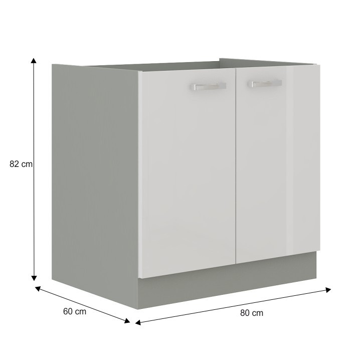Dolní skříňka PRADO 80D 2F BB Materiál: laminovaná DTD Barva: šedá/bílý extra vysoký lesk Rozměry (ŠxHxV): 80x52/60x82 cm Hloubka bez pracovní desky: 52 cm Hloubka s pracovní deskou: 60 cm Dodávané v demontu. Dodávané bez pracovní desky. tloušťka pracovní desky 28 mm, horní i dolní rozměr 2,6 m, dolní skříňky ZZ jsou dodávány včetně pracovní desky a dolní lišty, dřezová skříňka bez pracovní desky. Sektorové skrinky sú dodávané bez pracovnej dosky vrátane spodnej lišty.Možnosť dokúpiť PD metalic brown v cene 1.650 Kč/1m. Možnosť dokúpiť univerzálny Ľ/P drez LAY ON.