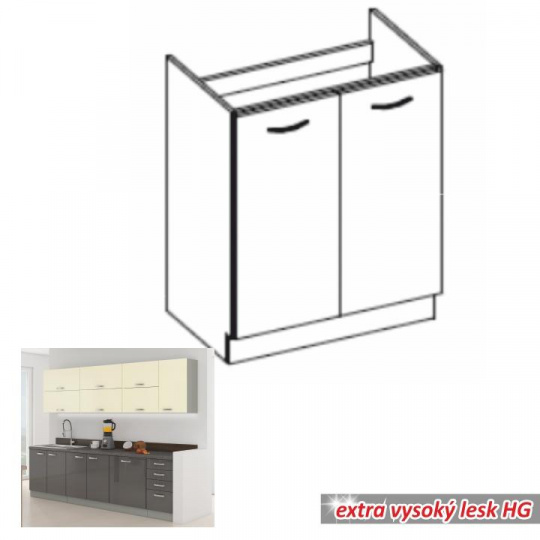 Skříňka dolní dřezová, šedá vysoký lesk, PRADO 80 ZL 2F BB
