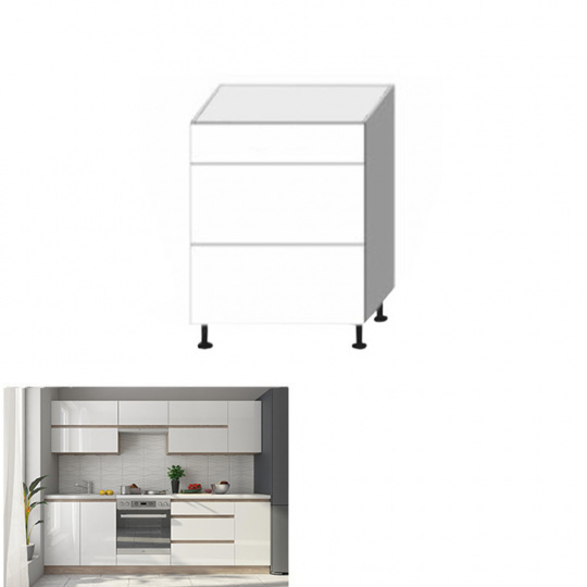 Dolní skříňka D 60 LINE Materiál: DTD laminovaná Provedení: vysoký bílý lesk / dub sonoma Rozměry (ŠxHxV): 60x54,5x82 cm 3 šuplíky Systém tichého dorazu šuplíků Dodávaná s pracovní deskou a dolní lištou úložný prostor moderní design Dodávané v demontu. Možnost dokoupit dřez LAY ON. Možnost dokoupit pracovní desku 38 mm v ceně 1.650 Kč / bm.