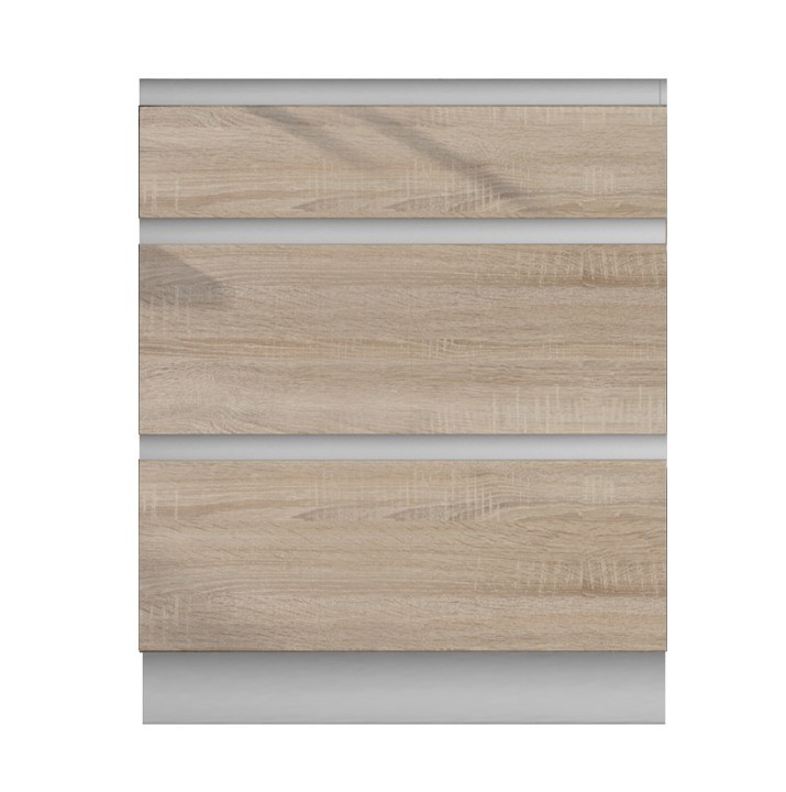 Dolní skříňka D 60 LINE Materiál: DTD laminovaná Provedení: dub sonoma / bílá Rozměry (ŠxHxV): 60x54,5x82 cm 3 šuplíky Systém tichého dorazu šuplíků Dodávaná s pracovní deskou a dolní lištou úložný prostor moderní design Dodávané v demontu. Možnost dokoupit dřez LAY ON. Možnost dokoupit pracovní desku 38 mm v ceně 1.690 Kč / bm.