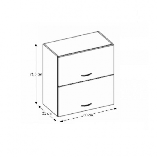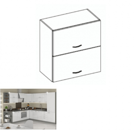 Horní skříňka 60 GU 72 Materiál: laminovaná DTD/ kov Provedení: bílá extra vysoký lesk / šedá Rozměry (ŠxHxV): 60x31x71,5 cm Korpus šedé barvy kovové úchytky Dvířka extra vysoký lesk HG Systém tichého zavírání dvířek Systém tichého dorazu zásuvek Dodávané v demontu tloušťka pracovní desky 28 mm, horní i dolní rozměr 2,6 m, dolní skříňky ZZ jsou dodávány včetně pracovní desky a dolní lišty, dřezová skříňka bez pracovní desky. Sektorové skrinky sú dodávané bez pracovnej dosky vrátane spodnej lišty.Možnosť dokúpiť PD metalic brown v cene 1.650 Kč/1m. Možnosť dokúpiť univerzálny Ľ/P drez LAY ON.