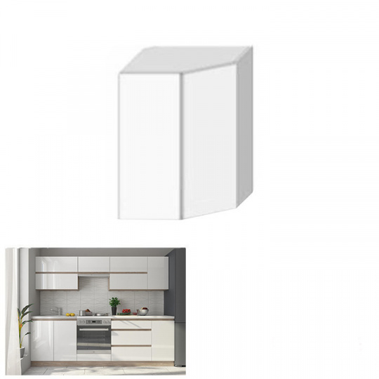Horní rohová skříňka GR LINE Materiál: DTD laminovaná Provedení: vysoký bílý lesk / dub sonoma Rozměry (ŠxHxV): 52,5x52,5x60 cm S dvířky úložný prostor moderní design Dodávané v demontu. Možnost dokoupit dřez LAY ON. Možnost dokoupit pracovní desku 38 mm v ceně 1.650 Kč / bm.