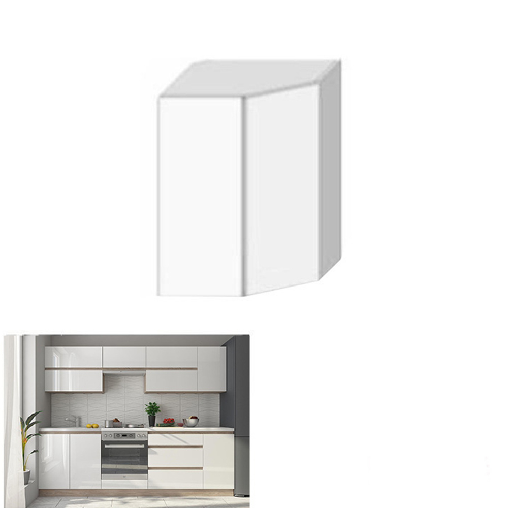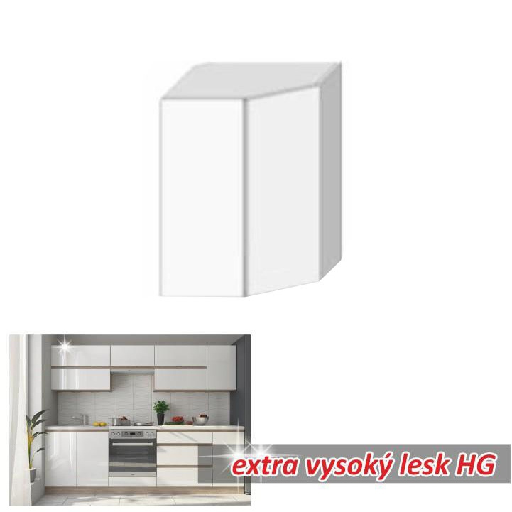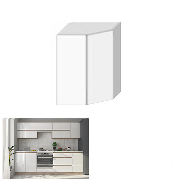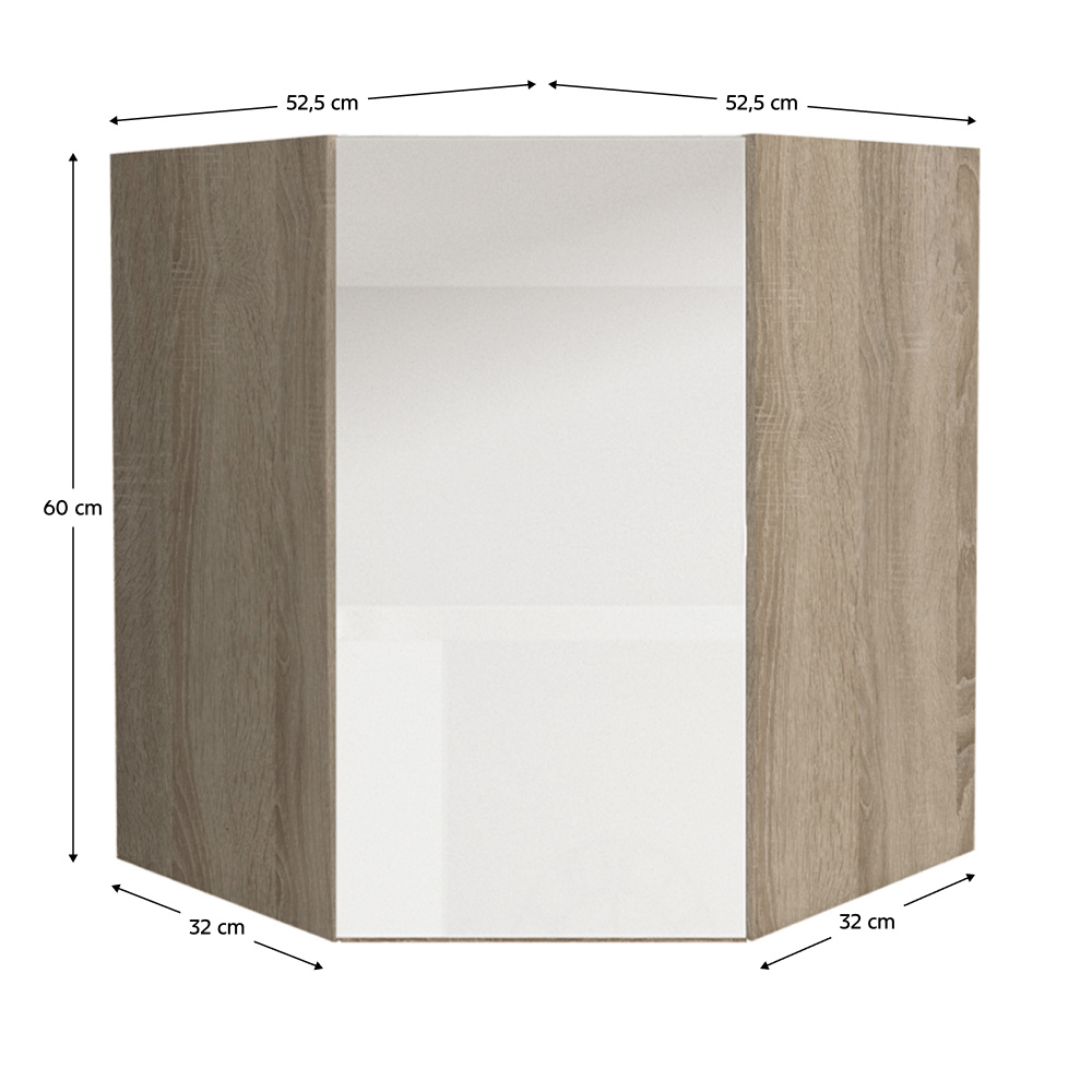 Horní rohová skříňka GR LINE Materiál: DTD laminovaná Provedení: vysoký bílý lesk / dub sonoma Rozměry (ŠxHxV): 52,5x52,5x60 cm S dvířky úložný prostor moderní design Dodávané v demontu. Možnost dokoupit dřez LAY ON. Možnost dokoupit pracovní desku 38 mm v ceně 1.650 Kč / bm.