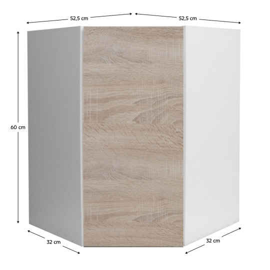 Horní rohová skříňka GR LINE Materiál: DTD laminovaná Provedení: dub sonoma / bílá Rozměry (ŠxHxV): 52,5x52,5x60 cm S dvířky úložný prostor moderní design Dodávané v demontu. Možnost dokoupit dřez LAY ON. Možnost dokoupit pracovní desku 38 mm v ceně 1.650 Kč / bm.