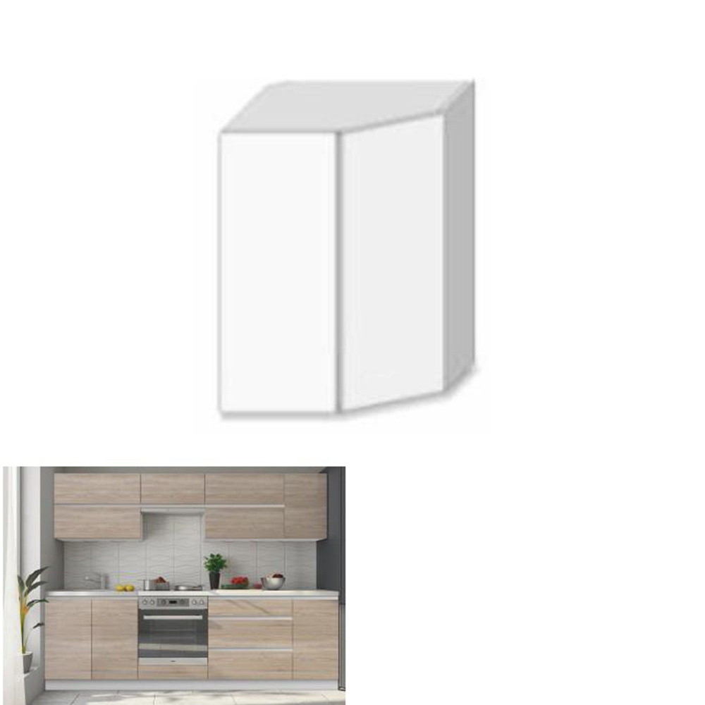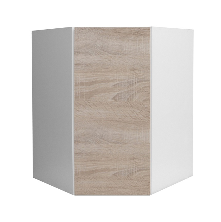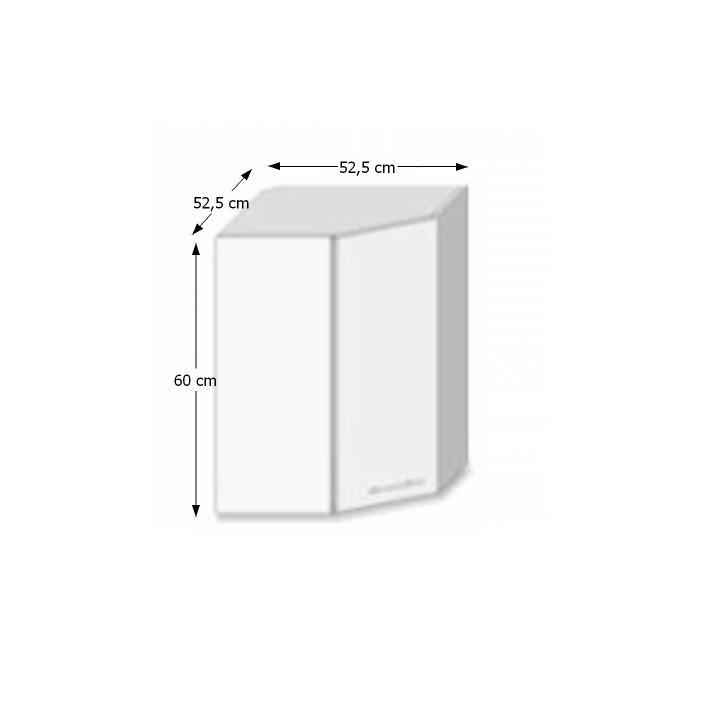 Horní rohová skříňka GR LINE Materiál: DTD laminovaná Provedení: dub sonoma / bílá Rozměry (ŠxHxV): 52,5x52,5x60 cm S dvířky úložný prostor moderní design Dodávané v demontu. Možnost dokoupit dřez LAY ON. Možnost dokoupit pracovní desku 38 mm v ceně 1.650 Kč / bm.