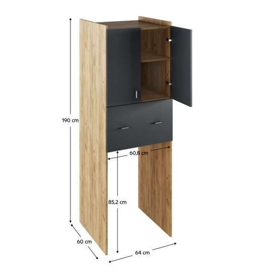 Materiál: DTD laminovaná Barva: dub artisan/grafit Rozměry (ŠxHxV): 64x60x190 cm Prostor na pračku (ŠxV): 60,8x85,2 cm S úložným prostorem Skříňka s policemi Šuplík Nosnost šuplíku a polic: 5 kg Tloušťka materiálu korpus: 16 mm Prostor pro pračku Kvalitní slovenský výrobek Dodáváno v demontu