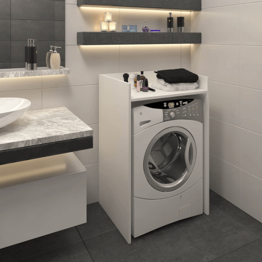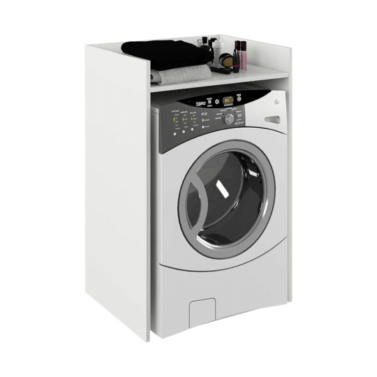Materiál: laminovaná DTD Barva: bílá Rozměry (ŠxHxV): 64x50x97,5 cm Prostor pro pračku (ŠxV): 60,8x86,4 cm Tloušťka materiálu: 1,6 cm Nosnost vrchní desky: 10 kg Postavena na kluzácích Doporučujeme připevnit ke zdi Kvalitní slovenský výrobek Dodáváno v demontu