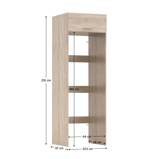 Materiál: laminovaná DTD Barva: dub sonoma Rozměry (ŠxHxV): 67,5x67x210 cm Prostor pro pračku a sušičku (ŠxHxV): 64x65x180 cm Tloušťka materiálu: 1,6 cm Otevřený úložný prostor Výklopná skříňka Nosnost skříňky: 5 kg S úchytkou Vhodný na pračku a sušičku Přináší organizaci a uspořádání do koupelny a prádelny Doporučujeme připevnit ke zdi Kvalitní slovenský výrobek Dodáváno v demontu