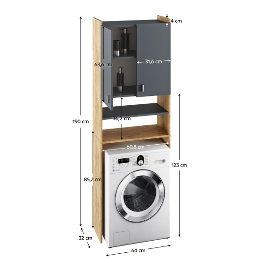 Materiál: laminovaná DTD Barva: dub artisan/grafit Rozměry (ŠxHxV): 64x32x190 cm Skříňka (ŠxHxV): 64x30x63,6 cm Šířka dvířek: 31,6 cm Regálová police (ŠxHxV): 64x32x123 cm Výška mezi policemi: 36,2 cm Prostor na pračku (ŠxHxV): 60,8x32x85,2 cm Přečnívající část nad skříňkou: 4 cm Tloušťka materiálu: 16 mm S policemi Dvoudveřová skříňka Kvalitní slovenský výrobek. Dodávané v demontu