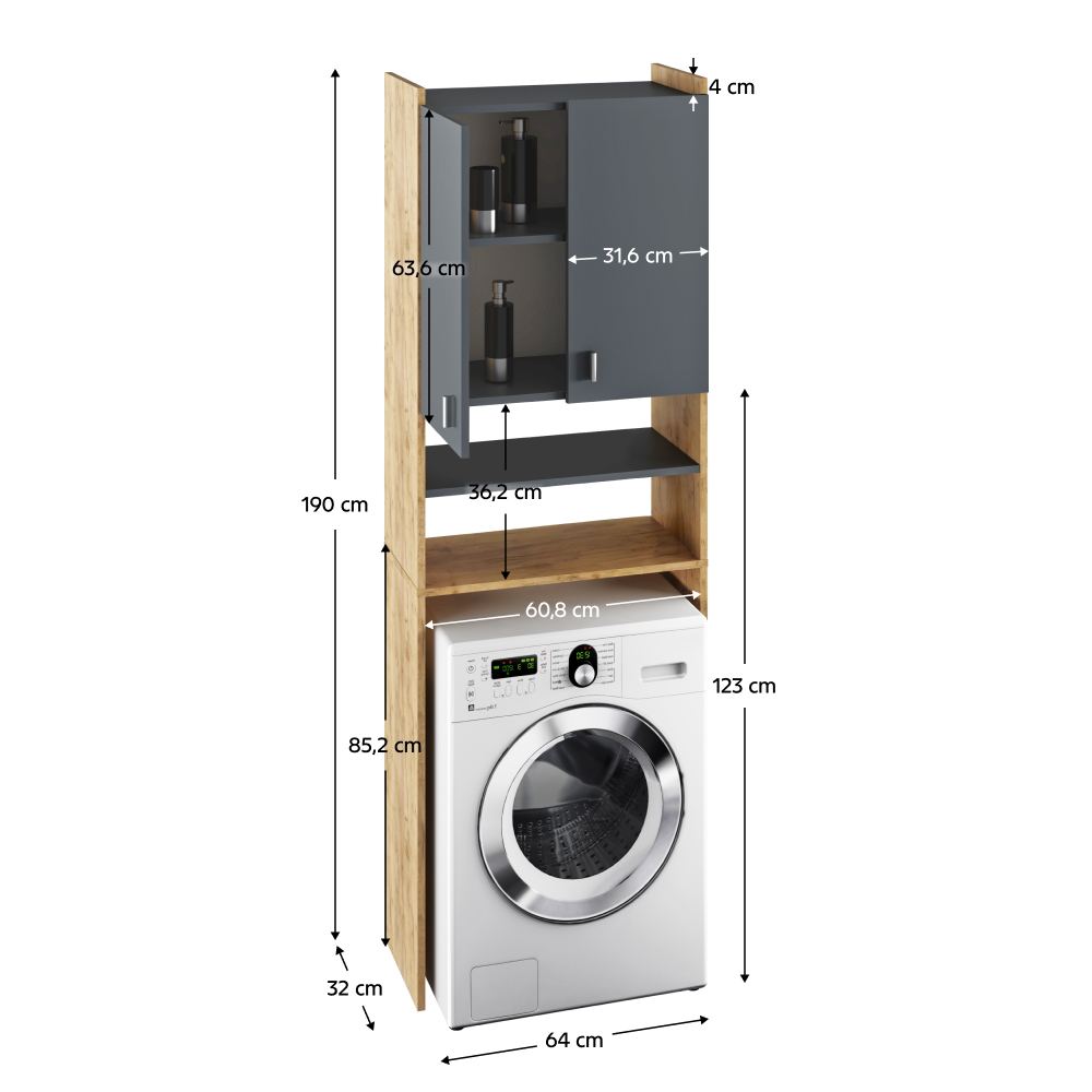 Materiál: laminovaná DTD Barva: dub artisan/grafit Rozměry (ŠxHxV): 64x32x190 cm Skříňka (ŠxHxV): 64x30x63,6 cm Šířka dvířek: 31,6 cm Regálová police (ŠxHxV): 64x32x123 cm Výška mezi policemi: 36,2 cm Prostor na pračku (ŠxHxV): 60,8x32x85,2 cm Přečnívající část nad skříňkou: 4 cm Tloušťka materiálu: 16 mm S policemi Dvoudveřová skříňka Kvalitní slovenský výrobek. Dodávané v demontu