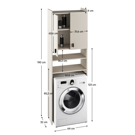 Materiál: laminovaná DTD Barva: kašmír Rozměry (ŠxHxV): 64x32x190 cm Skříňka (ŠxHxV): 64x30x63,6 cm Šířka dvířek: 31,6 cm Regálová police (ŠxHxV): 64x32x123 cm Výška mezi policemi: 36,2 cm Prostor na pračku (ŠxHxV): 60,8x32x85,2 cm Přečnívající část nad skříňkou: 4 cm Tloušťka materiálu: 16 mm S policemi Dvoudveřová skříňka Kvalitní slovenský výrobek. Dodávané v demontu