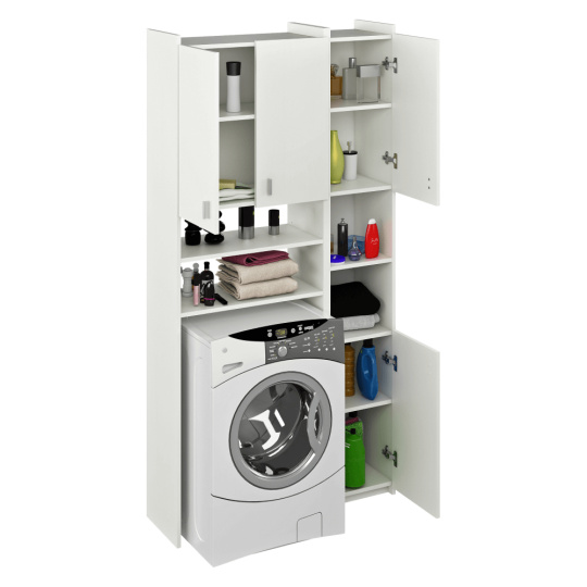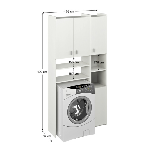 Materiál: laminovaná DTD Barva: bílá Rozměry (ŠxHxV): 96x32x190 cm Rozměr pro pračku (ŠxHxV): 60,8x32x85 cm Tloušťka materiálu: 1,6 cm Otevřený úložný prostor S policemi Nosnost na polici: 5 kg S plastovými úchytkami Skříňka je postavena na kluzácích Čtyřdveřová skříňka Univerzální dvířka na regálu Praktické vytvoření úložného prostoru Kvalitní slovenský výrobek Přináší organizaci a uspořádání do koupelny Doporučujeme připevnit ke zdi Dodáváno v demontu