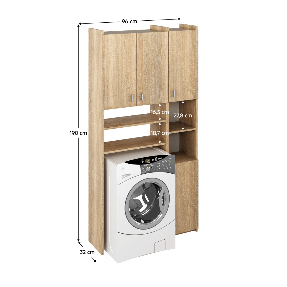 Materiál: laminovaná DTD Barva: dub sonoma Rozměry (ŠxHxV): 96x32x190 cm Rozměr pro pračku (ŠxHxV): 60,8x32x85 cm Tloušťka materiálu: 1,6 cm Otevřený úložný prostor S policemi Nosnost na polici: 5 kg S plastovými úchytkami Skříňka je postavena na kluzácích Čtyřdveřová skříňka Univerzální dvířka na regálu Praktické vytvoření úložného prostoru Kvalitní slovenský výrobek Přináší organizaci a uspořádání do koupelny Doporučujeme připevnit ke zdi Dodáváno v demontu