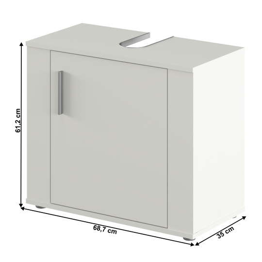 Materiál: DTD laminovaná Barva: matná bílá Rozměry (ŠxHxV): 68,7x35x61,2 cm Tloušťka materiálu: 1,6 cm Plastové úchytky Barva úchytek: šedá Plastové kluzáky Barva kluzáků: šedá Výška kluzáků: 1,6 cm 1-dveřová Vrchní deska s výřezem na umyvadlo Bez umyvadla Moderní design Dodáváno v demontu