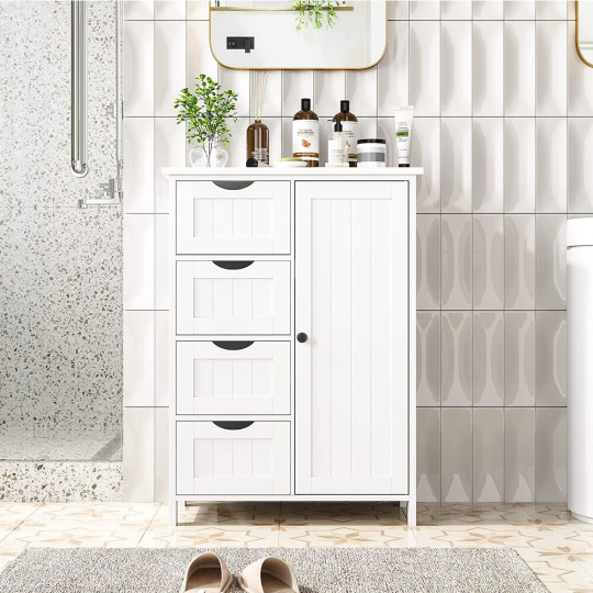 Materiál: MDF Barva: bílá Rozměry (ŠxHxV): 50x30x82,7 cm Tloušťka materiálu MDF: 1,2 cm Skříňka Regál Komoda Jednodveřová Jedna skříňka Police Šířka police: 21,5 cm Výška mezi policemi: 37,1 cm Čtyři zásuvky Rozměry zásuvka (ŠxV): 21,5x17,5 cm Na nožičkách Výška spodního prostoru od podlahy: 4,9 cm S úchytkami Materiál úchytek: zinek Barva úchytek: černá Praktická Nosnost vrchní desky: 20 kg Nosnost police: 10 kg Nosnost zásuvka: 3 kg Doporučujeme připevnit ke zdi Dodáváno v demontu