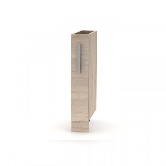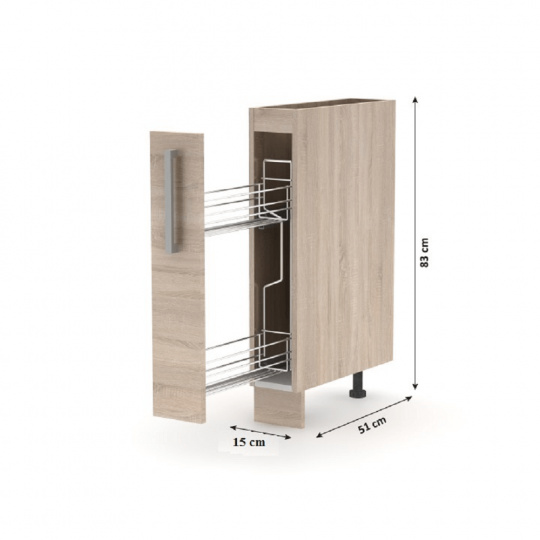 Skříňka s výsuvným košem 1 DV NOPL-066-VK Materiál: DTD laminovaná Barva: dub sonoma Rozměry (ŠxHxV): 15x51x83 cm Tloušťka materiálu: 16 mm Kvalitní slovenský výrobek. Dodávané v demontu. Cena za pracovní desku je 1.590, - Kč za bm - tloušťka 38 mm. Horní rozměr kuchyňské sestavy je 2,4 m, spodní rozměr je 1,8 m. Tloušťka materiálu: 16 mm Základní kuchyňská sestava a všechny spodní skříňky jsou dodávány bez pracovní desky, včetně dolní lišty. Možnost dokoupit univerzální L / P dřez LAY ON.