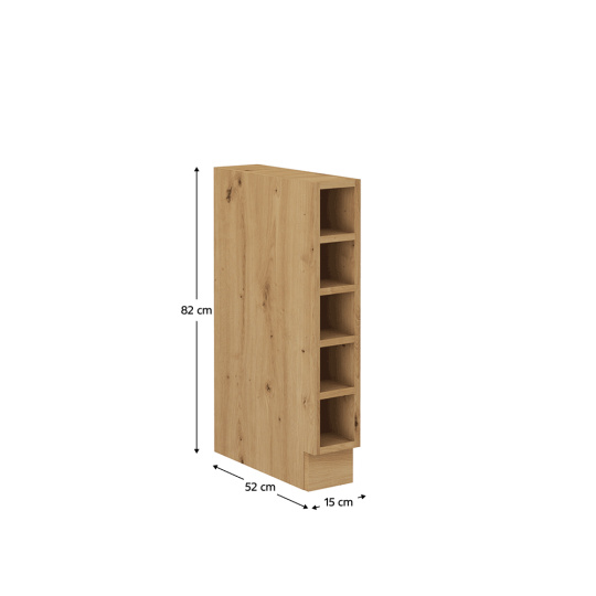 Materiál: laminovaná DTD Barva: dub artisan Rozměry (ŠxHxV): 15x52x82 cm Tloušťka materiálu: 1,6 cm otevřená Se 4 policemi S dolní lištou / soklem Bez pracovní desky Je třeba zakoupit pracovní desku a položit na skříňku Pracovní desku dub artisan s tloušťkou 3,8cm lze doobjednat Moderní dynamický design Dodávané v demontu Možnost dokoupení pracovní desky dub artisan v ceně: 1 890 Kč/m Možnost t dokoupení univerzálního P / Ľ dřezu LAY ON.