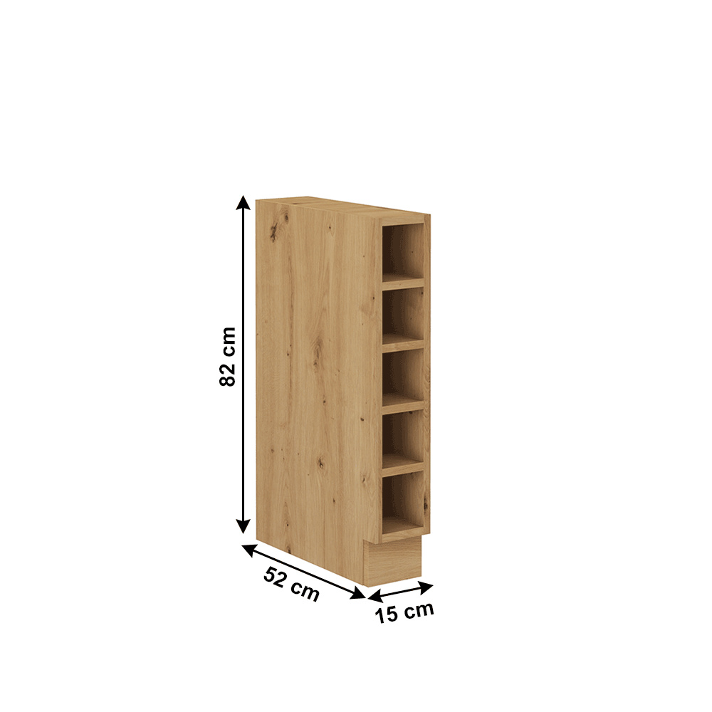 Materiál: laminovaná DTD Barva: dub artisan Rozměry (ŠxHxV): 15x52x82 cm Tloušťka materiálu: 1,6 cm otevřená Se 4 policemi S dolní lištou / soklem Bez pracovní desky Je třeba zakoupit pracovní desku a položit na skříňku Pracovní desku dub artisan s tloušťkou 3,8cm lze doobjednat Moderní dynamický design Dodávané v demontu Možnost dokoupení pracovní desky dub artisan v ceně: 1 890 Kč/m Možnost t dokoupení univerzálního P / Ľ dřezu LAY ON.