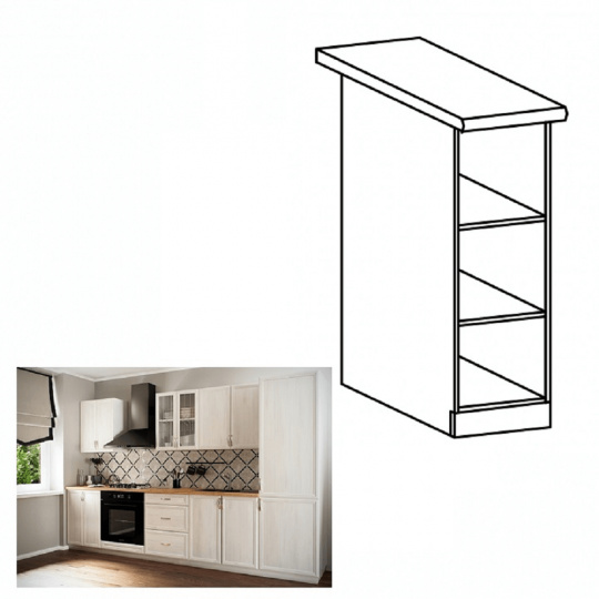 Spodní otevřená skříňka D20P ke kuchyni SICILIA Provedení: DTD laminovaná Barva: bíla Rozměry (ŠxHxV): 20x45x82 cm Tloušťka materiálu: 15 mm Spodní skříňky jsou dodávány bez pracovní desky. Můžete si objednat pracovní desku royal beigemarble k provedení ořech Milano - tloušťka 28mm za 1.590 Kč/bm a nebo pracovní desku dub Lancelot k provedení sosna andersen - tloušťka 38 mm za 1.690 Kč/bm.