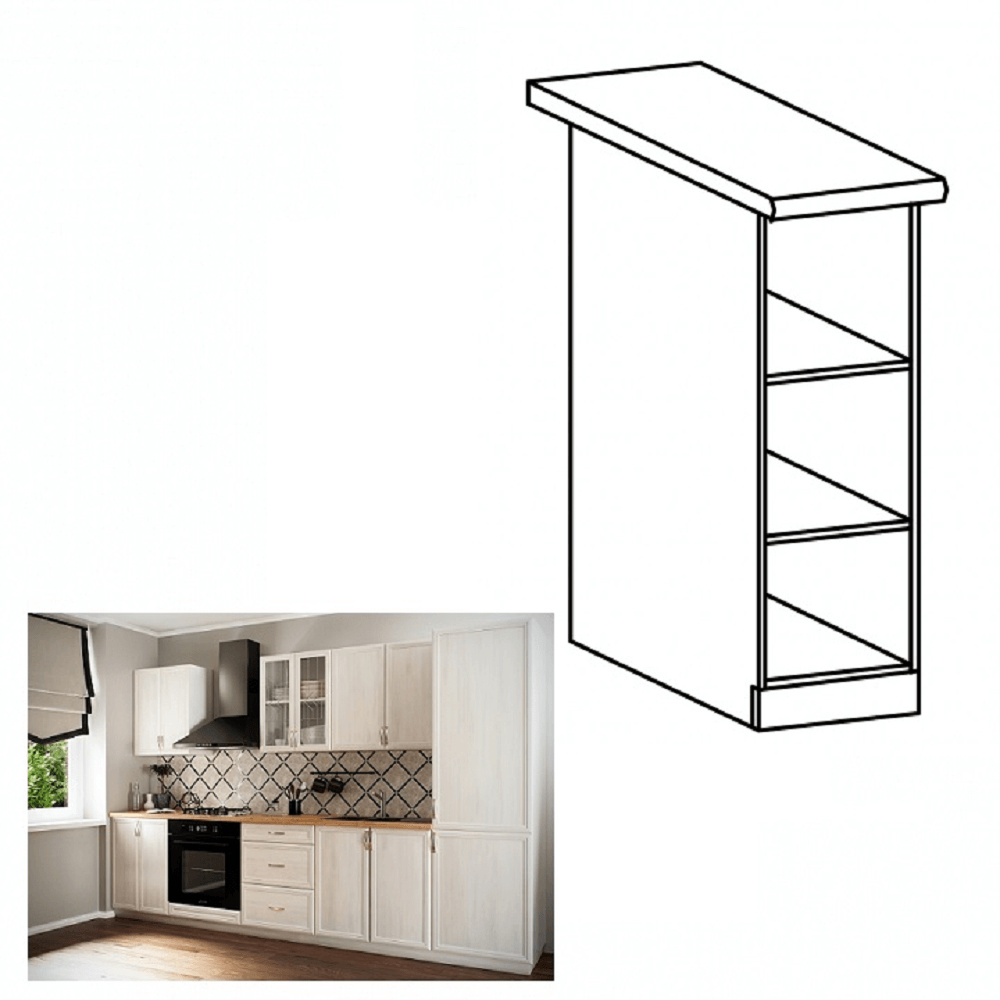 Spodní otevřená skříňka D20P ke kuchyni SICILIA Provedení: DTD laminovaná Barva: bíla Rozměry (ŠxHxV): 20x45x82 cm Tloušťka materiálu: 15 mm Spodní skříňky jsou dodávány bez pracovní desky. Můžete si objednat pracovní desku royal beigemarble k provedení ořech Milano - tloušťka 28mm za 1.790 Kč/bm a nebo pracovní desku dub Lancelot k provedení sosna andersen - tloušťka 38 mm za 1.890 Kč/bm.