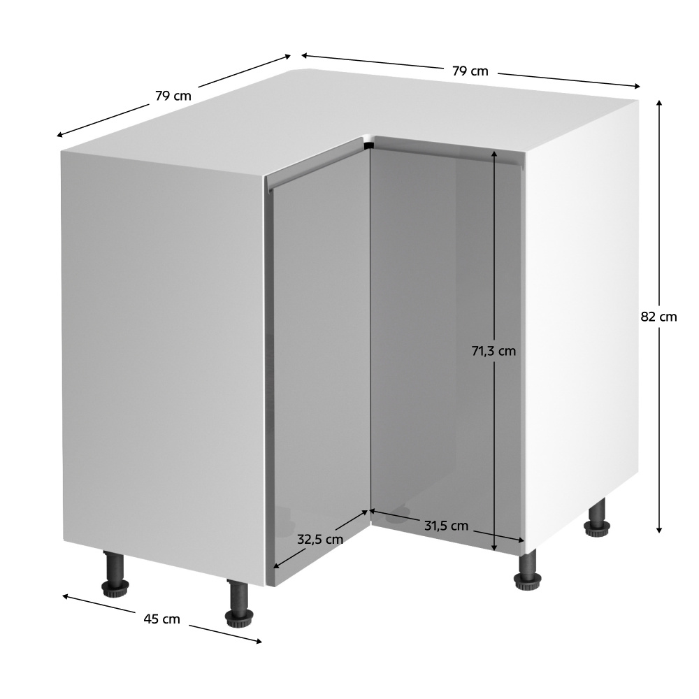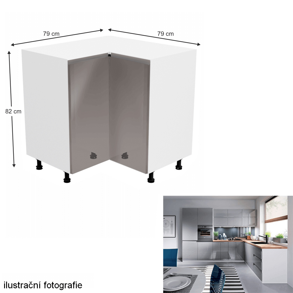 Spodní rohová skříňka, Aurora D90N Provedení: DTD laminové / MDF Barva: bílá / šedá extra vysoký lesk Rozměry (ŠxHxV): 79 / 90x79 / 90x82 cm Tloušťka materiálu: 15 mm Pracovní deska není součástí skříněk. Je možné si doobjednat pracovní desku v provedení dub artisan o tloušťce 38 mm za 1.890 Kč/bm. Možnost dokoupit dřez, dřezovou baterii a příslušenství. Ke spodním skříňkám máte možnost dokoupit spodní lištu/sokl v bílé barvě o rozměru 1 bm za 280 Kč nebo 2 bm za 560 Kč a ukončení na sokl o hloubce 47 cm nebo 58 cm za 210 Kč. Ke každé dolní skříňce, kromě D25PZ, je třeba doobjednat 2 ks úchytek na sokl - cena 40 Kč/2ks.