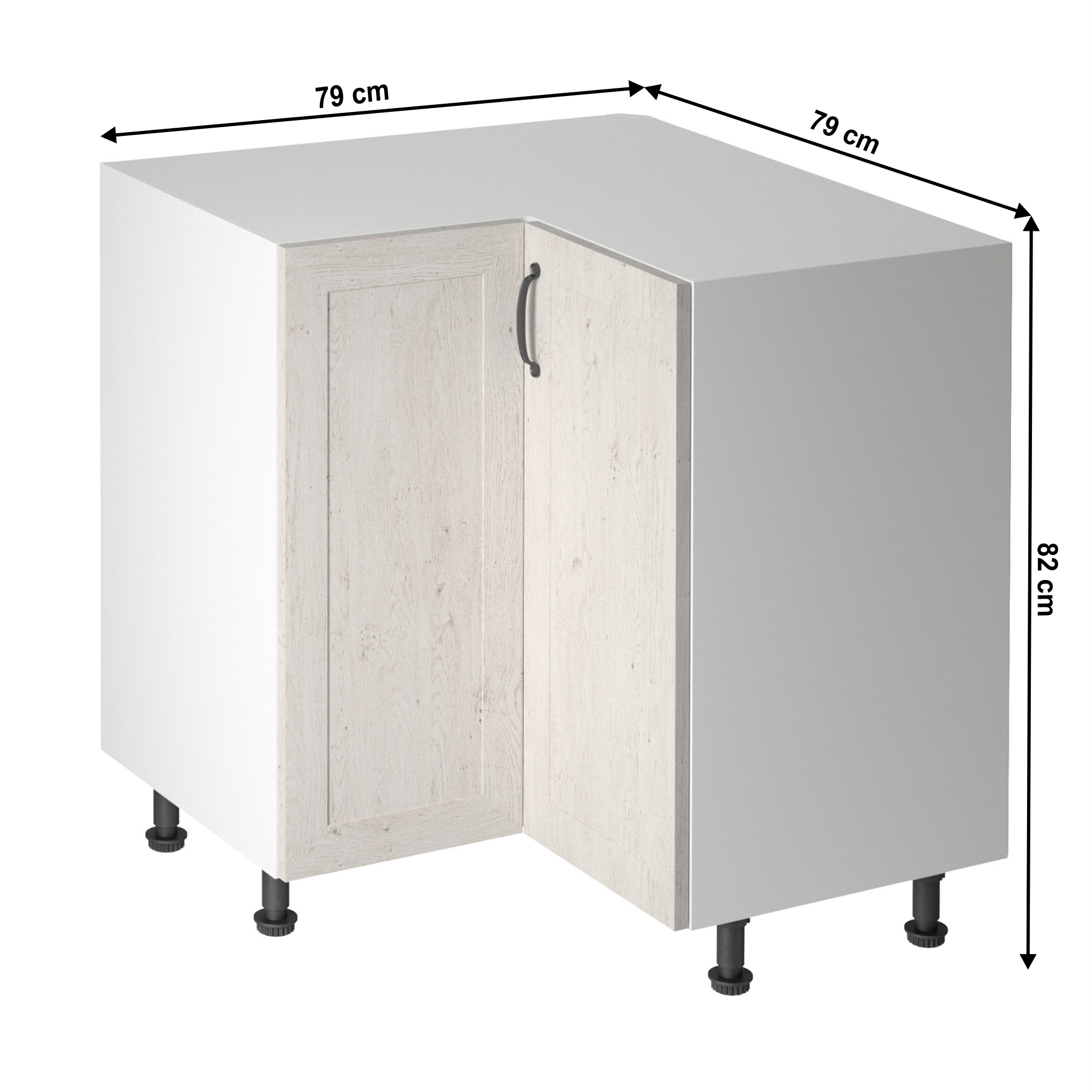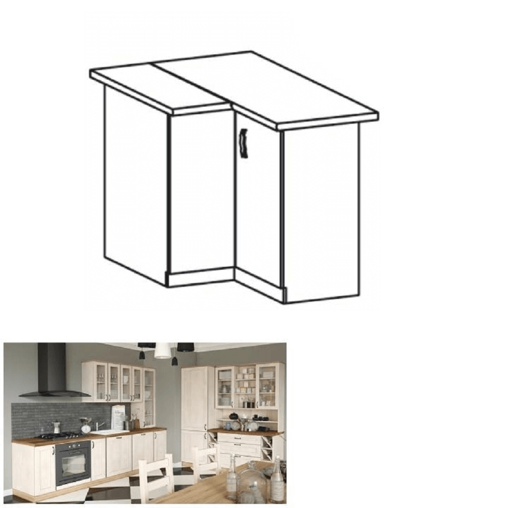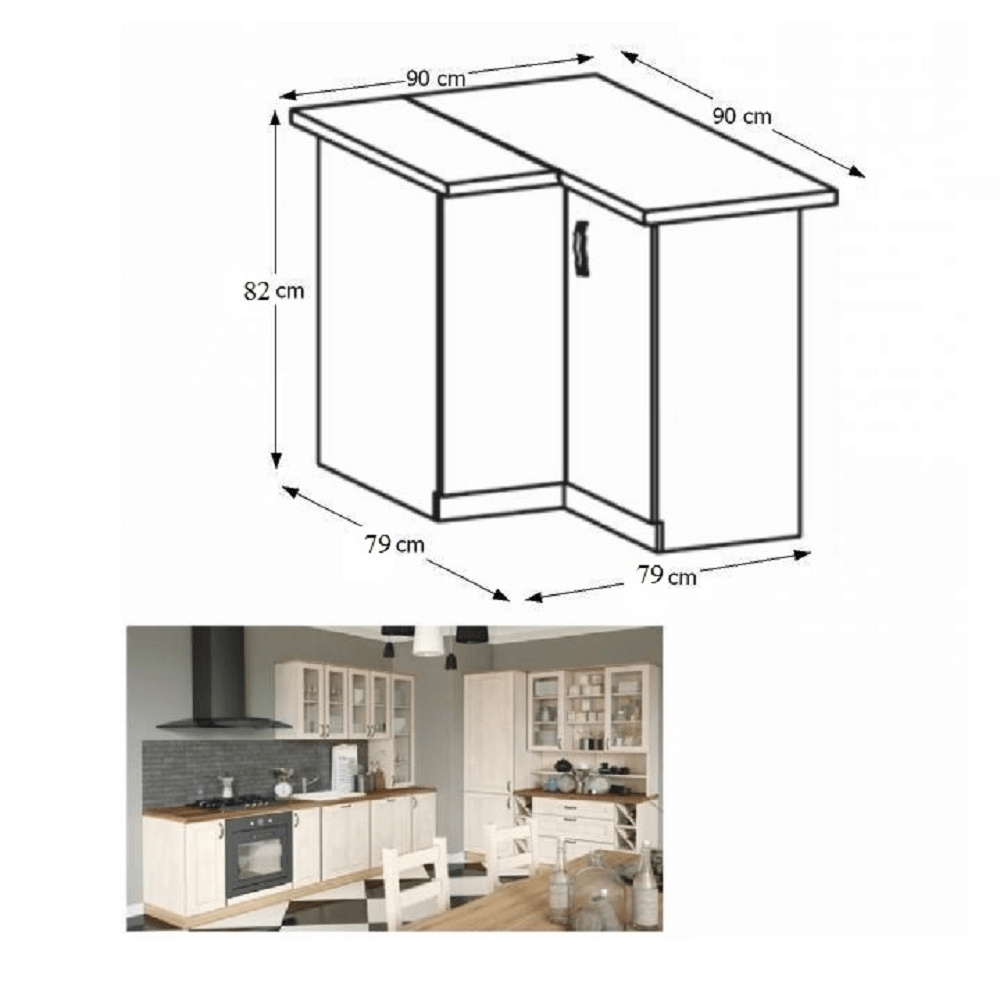 Spodní rohová skříňka, ROYAL D90N Materiál: korpus je vyroben z kvalitní laminované dřevotřísky Barva: bílá/sosna skandinávska Rozměry ŠxHxV: 79/90x79/90x82 cm Tloušťka materiálu: 15 mm Pravé provedení Dodávané v demontu. Spodní skříňky ke kuchyni ROYAL jsou dodávány bez pracovní desky a bez soklu. Pracovní desku Dub Porterhouse tmavý lze doobjednat v tloušťce 3,8 cm v ceně 1690 Kč/1 bm. Ke každé dolní skříňce, kromě rohových skříněk D25PZ, je třeba doobjednat i sokel v provedení dub divoký v ceně 270 Kč/1 bm a 2 kusy úchytů na sokl v ceně 30 Kč/2 ks. Ke spodním skříňkám máte možnost dokoupit také ukončení na sokl o hloubce 47 cm a 56 cm za 210 Kč. Objednávku vepište do poznámky v objednávkovém formuláři.