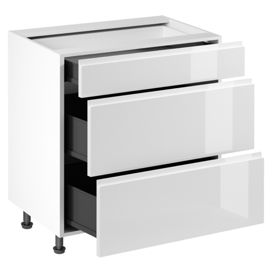 Spodní skříňka, Aurora D80S3 Materiál: DTD laminovaná/MDF Barva: bílá/bílá extra vysoký lesk Rozměry (ŠxHxV): 80x47x82 cm Tloušťka materiálu : 15 mm 3 šuplílky Bez úchytek Šuplík typu METALBOX Systém tichého dorazu šuplíků Je nutné objednat potřebný počet ukončení spodní lišty Spodní lištu je nutno objednat zvlášť, přičemž daný rozměr je třeba uvést do poznámky Potřebné doobjednat 2 ks úchytů na sokl - cena 30 kč/2ks Dodáváno v demontu Pracovní deska není součástí skříněk. Je možné si doobjednat pracovní desku v provedení dub artisan o tloušťce 38 mm za 1.690 Kč/bm. Možnost dokoupit dřez, dřezovou baterii a příslušenství. Ke spodním skříňkám máte možnost dokoupit spodní lištu/sokl v bílé barvě o rozměru 1 bm za 210 Kč nebo 2 bm za 420 Kč a ukončení na sokl o hloubce 47 cm nebo 58 cm za 140 Kč. Ke každé dolní skříňce, kromě D25PZ, je třeba doobjednat 2 ks úchytek na sokl - cena 30 Kč/2ks.
