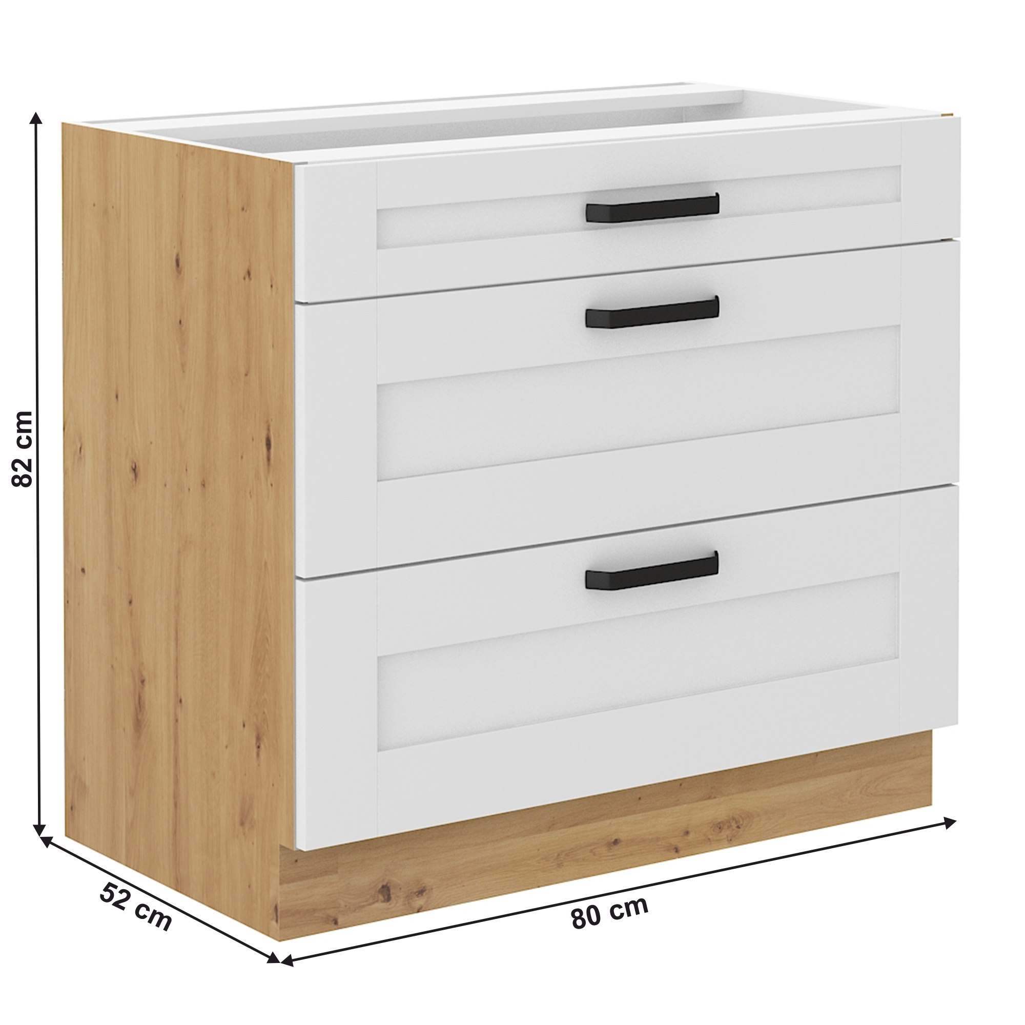Spodní skříňka LULA 80 D 3S BB Materiál: laminovaná DTD Barva: bílá/dub artisan Rozměry (ŠxHxV): 80x52x82 cm Tloušťka materiálu: 1,6 cm Šuplíková 3 šuplíky S kovovou úchytkou Barva úchytky: černá S dolní lištou/soklem Bez pracovní desky Moderní dynamický design Dodáváno v demontu Možnost dokoupit univerzální dřez LAY ON Spodní skříňky jsou dodávány včetně dolní lišty, bez pracovní desky. Možnost dokoupení pracovní desky dub artisan v ceně 1.890 Kč/bm.nebo marmur roma v ceně 1.790 Kč/bm. Možnost dokoupit univerzální dřez LAY ON.