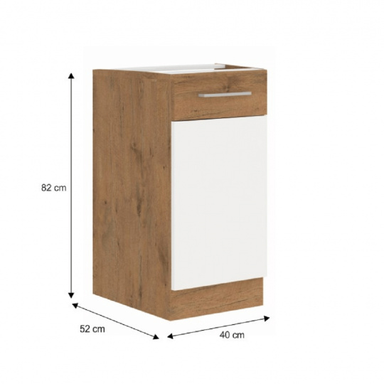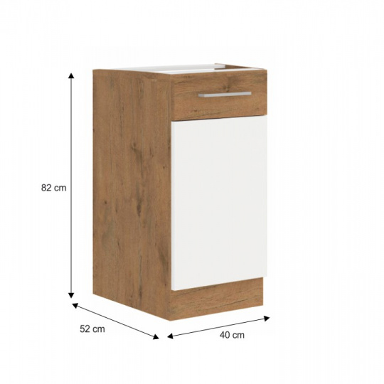 Spodní skříňka VEGA D40 1F BB Materiál: DTD laminovaná Barva: bílá extra vysoký lesk HG / dub lancelot Rozměry (ŠxHxV): 60x52x82 cm Skříňka bez pracovní desky Systém tichého zavírání dvířek Včetně spodní lišty Dodávané v demontu Spodní skříňky jsou dodávány včetně dolní lišty, bez pracovní desky. Možnost dokoupit pracovní desku dub lancelot v ceně: 1590 Kč/bm. Možnost dokoupit univerzální L / P dřez LAY ON.