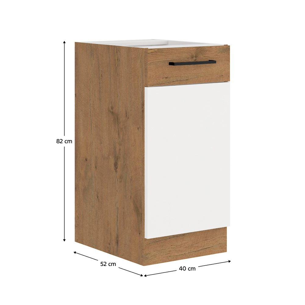 Spodní skříňka VEGA D40 1F BB Materiál: DTD laminovaná Barva: bílá extra vysoký lesk HG / dub lancelot Rozměry (ŠxHxV): 60x52x82 cm Skříňka bez pracovní desky Systém tichého zavírání dvířek Včetně spodní lišty Dodávané v demontu Spodní skříňky jsou dodávány včetně dolní lišty, bez pracovní desky. Možnost dokoupit pracovní desku dub lancelot v ceně: 1590 Kč/bm. Možnost dokoupit univerzální L / P dřez LAY ON.