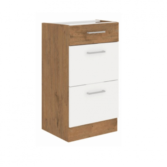 Spodní skříňka s 3 šuplíky VEGA D40 3S BB Materiál: DTD laminovaná Barva: dub lancelot / bílá extra vysoký lesk HG Rozměry (ŠxHxV): 40x52x82 cm Skříňka bez pracovní desky Systém tichého dorazu šuplíků Včetně spodní lišty Dodávané v demontu Spodní skříňky jsou dodávány včetně dolní lišty, bez pracovní desky. Možnost dokoupit pracovní desku dub lancelot v ceně: 1590 Kč/bm. Možnost dokoupit univerzální L / P dřez LAY ON.