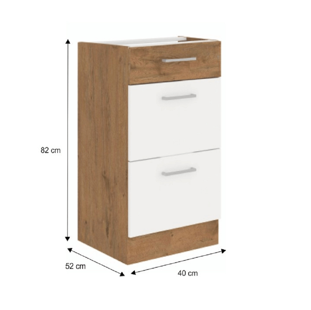 Spodní skříňka s 3 šuplíky VEGA D40 3S BB Materiál: DTD laminovaná Barva: dub lancelot / bílá extra vysoký lesk HG Rozměry (ŠxHxV): 40x52x82 cm Skříňka bez pracovní desky Systém tichého dorazu šuplíků Včetně spodní lišty Dodávané v demontu Spodní skříňky jsou dodávány včetně dolní lišty, bez pracovní desky. Možnost dokoupit pracovní desku dub lancelot v ceně: 1590 Kč/bm. Možnost dokoupit univerzální L / P dřez LAY ON.