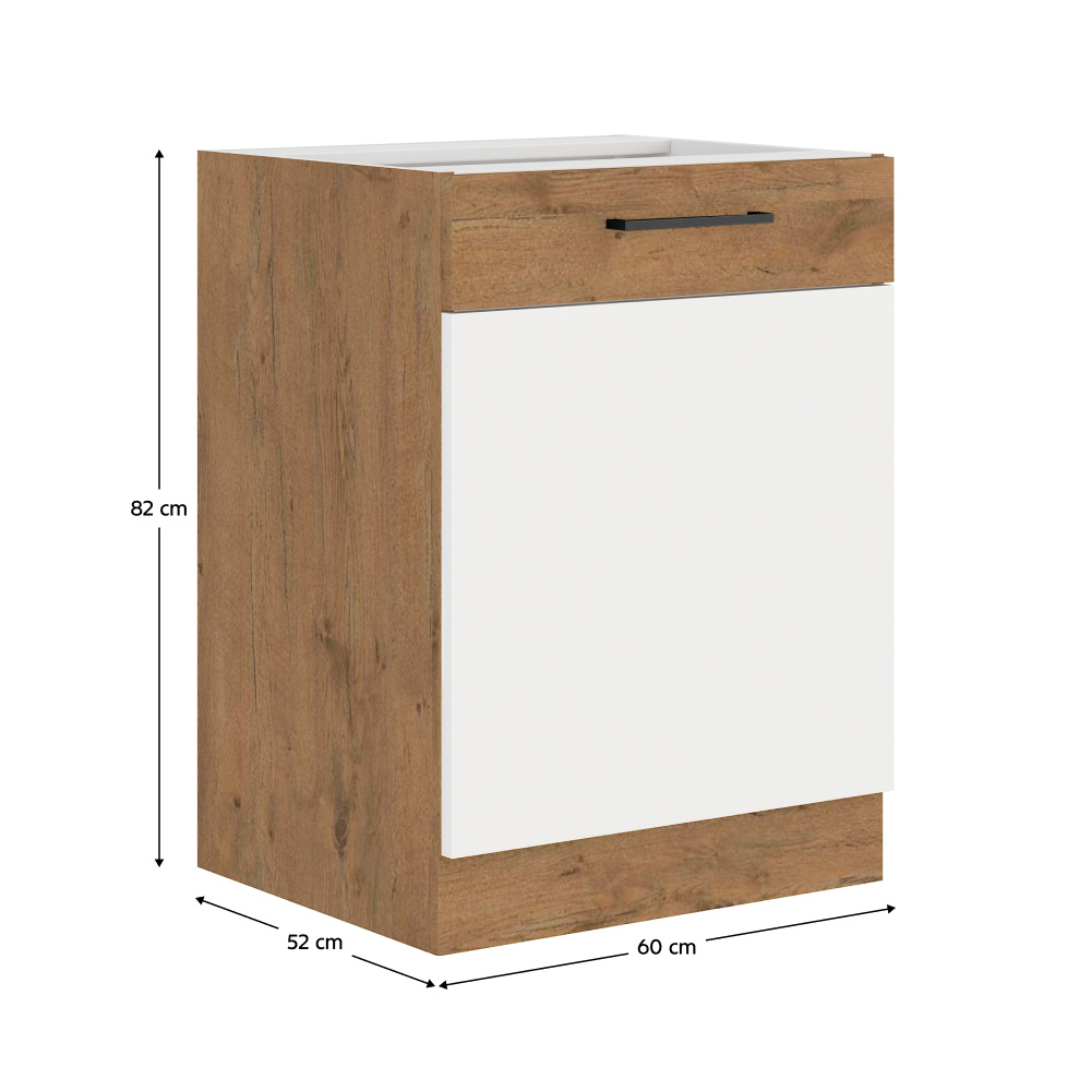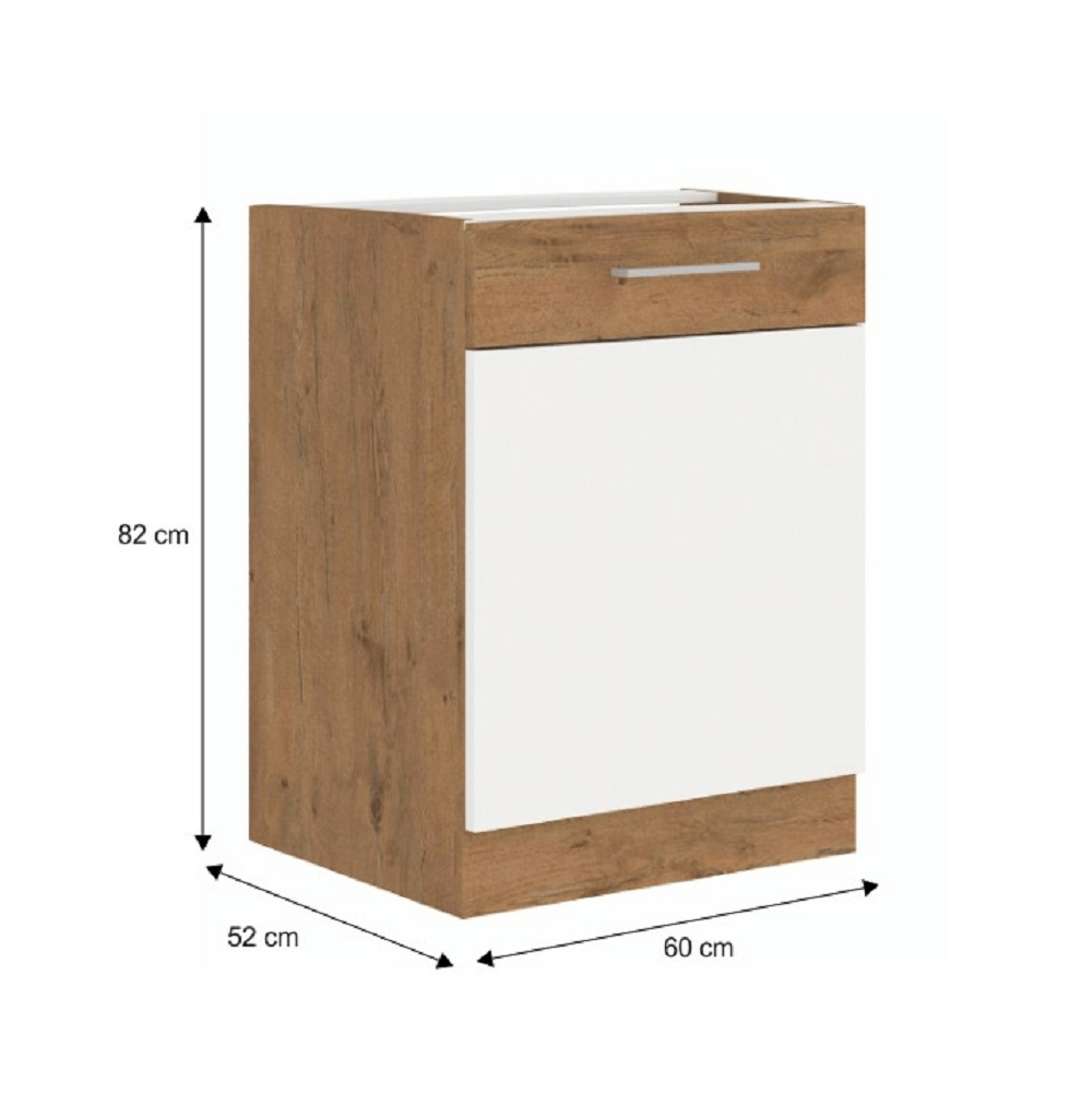 Spodní skříňka VEGA D60 1F BB Materiál: DTD laminovaná Barva: bílá extra vysoký lesk HG / dub lancelot Rozměry (ŠxHxV): 60x52x82 cm Skříňka bez pracovní desky Systém tichého zavírání dvířek Včetně spodní lišty Dodávané v demontu Spodní skříňky jsou dodávány včetně dolní lišty, bez pracovní desky. Možnost dokoupit pracovní desku dub lancelot v ceně: 1590 Kč/bm. Možnost dokoupit univerzální L / P dřez LAY ON.