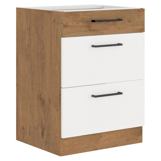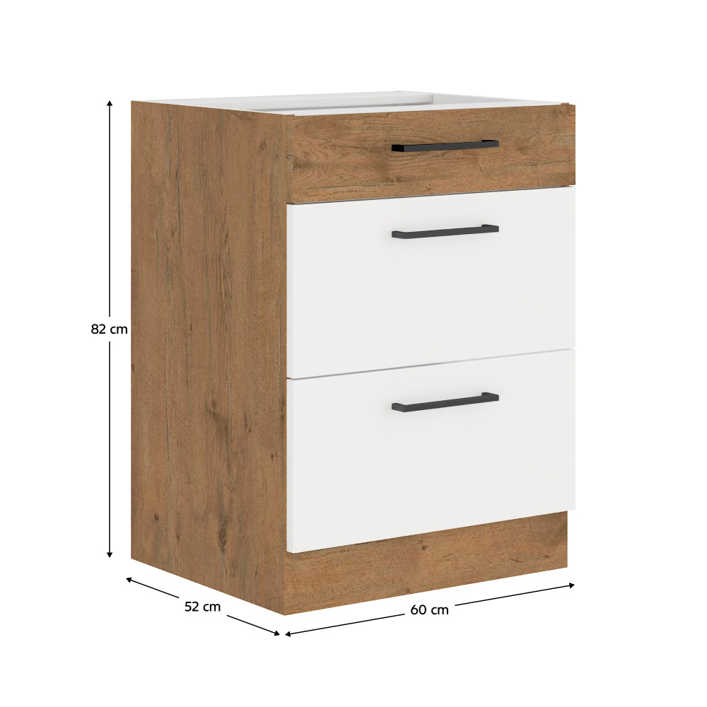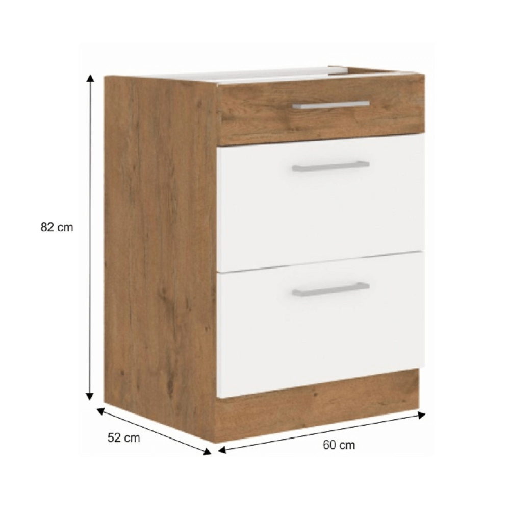Spodní skříňka s 3 šuplíky VEGA D60 3S BB Materiál: DTD laminovaná Barva: dub lancelot / bílá extra vysoký lesk HG Rozměry (ŠxHxV): 60x52x82 cm Skříňka bez pracovní desky Systém tichého dorazu šuplíků Včetně spodní lišty Dodávané v demontu Spodní skříňky jsou dodávány včetně dolní lišty, bez pracovní desky. Možnost dokoupit pracovní desku dub lancelot v ceně: 1590 Kč/bm. Možnost dokoupit univerzální L / P dřez LAY ON.