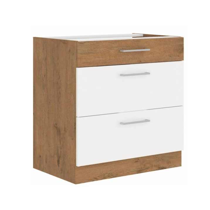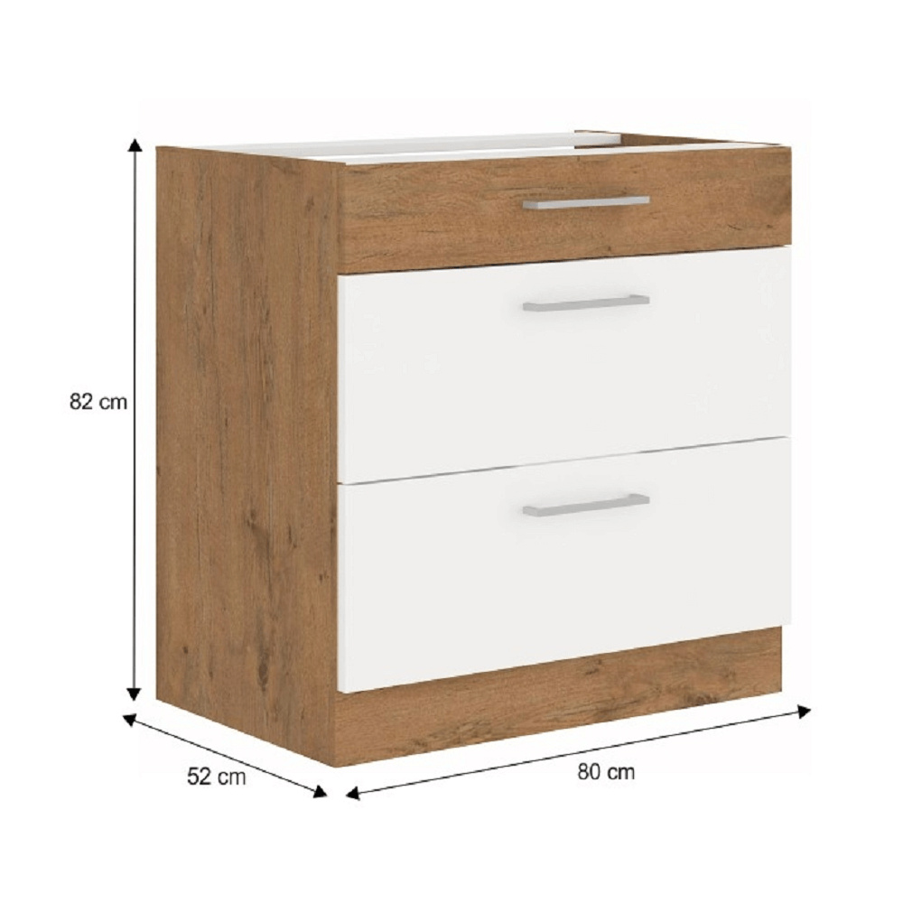Spodní skříňka s 3 šuplíky VEGA D80 3S BB Materiál: DTD laminovaná Barva: dub lancelot / bílá extra vysoký lesk HG Rozměry (ŠxHxV): 80x52x82 cm Skříňka bez pracovní desky Systém tichého dorazu šuplíků Včetně spodní lišty Dodávané v demontu Spodní skříňky jsou dodávány včetně dolní lišty, bez pracovní desky. Možnost dokoupit pracovní desku dub lancelot v ceně: 1590 Kč/bm. Možnost dokoupit univerzální L / P dřez LAY ON.